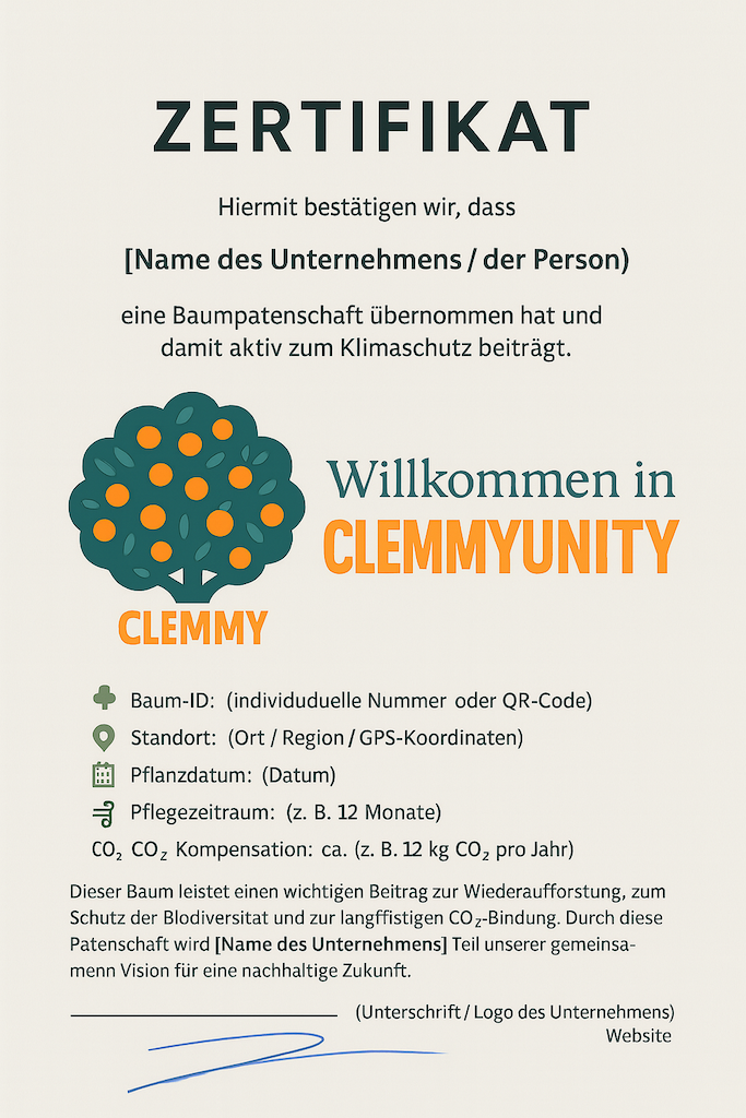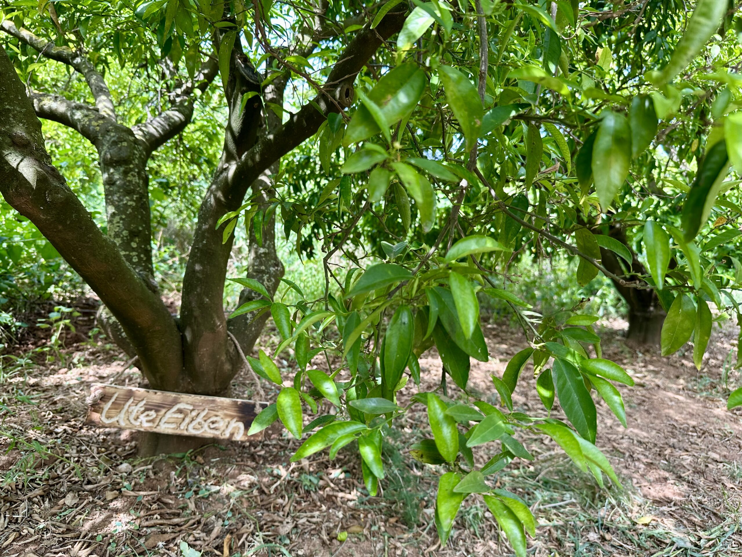 Hier siehst du unsere Clemenules-Bäume in Dénia, geschmückt mit ihren liebevoll handgefertigten Holz-Namensschildern – jedes einzelne Symbol für eine Patenschaft, eine Verbindung und ein Stück gemeinsamer Zukunft.